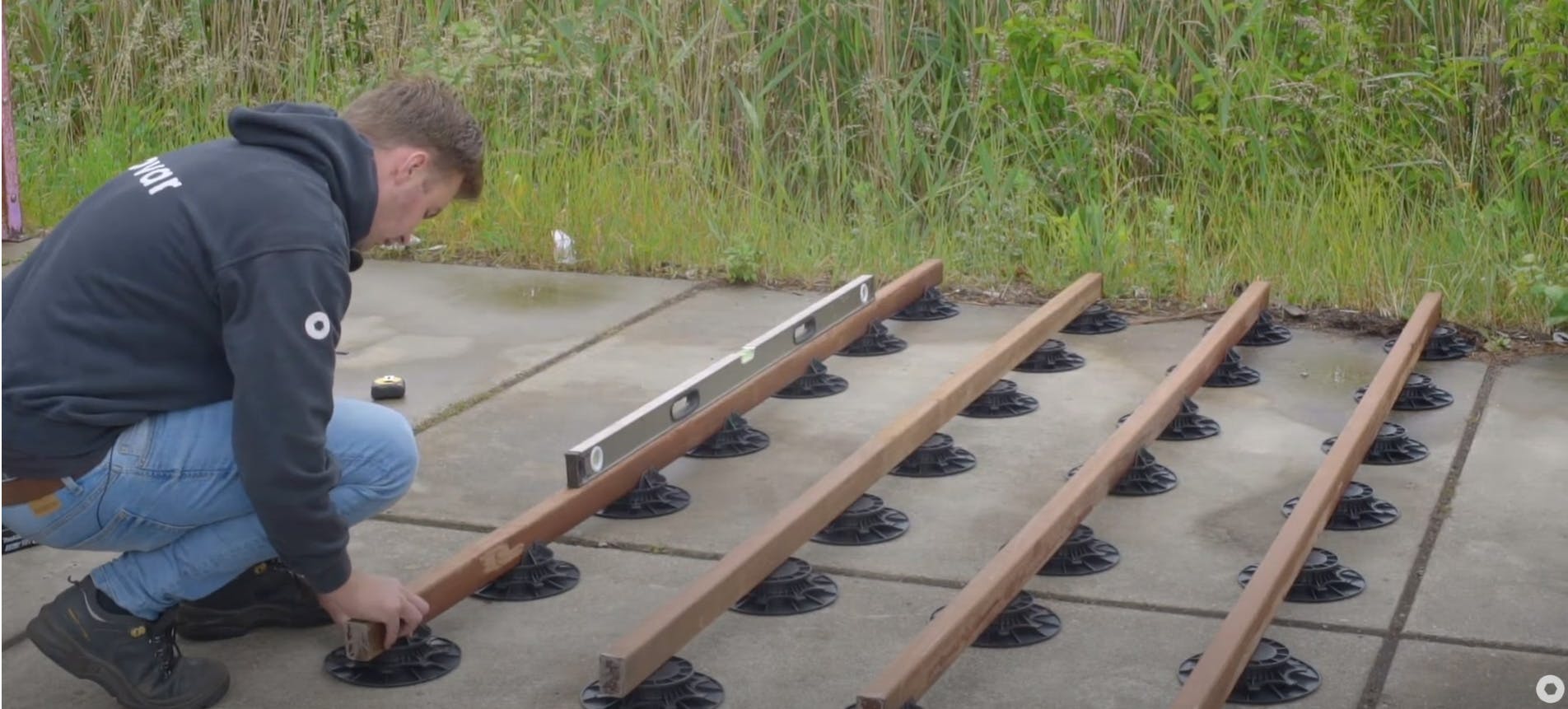 Controleer of de complete constructie volledig waterpas ligt en stevig is. Pas wanneer alles netjes recht staat, kun je beginnen met het monteren van de vlonderplanken.